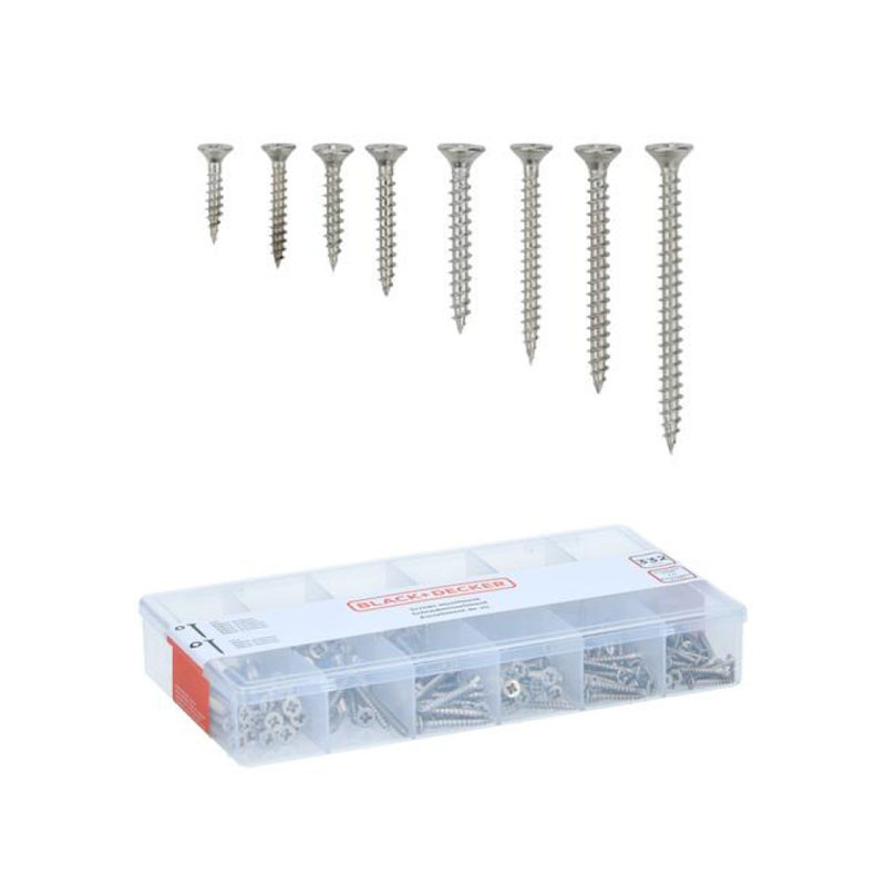 BLACK+DECKER 332 darabos, süllyesztett fejű fa csavar készlet praktikus műanyag tárolódobozban, mely alkalmas barkácsolóknak és szakembereknek egyaránt. A doboz tartós műanyagból készült, így könnyen szállítható és tárolható.