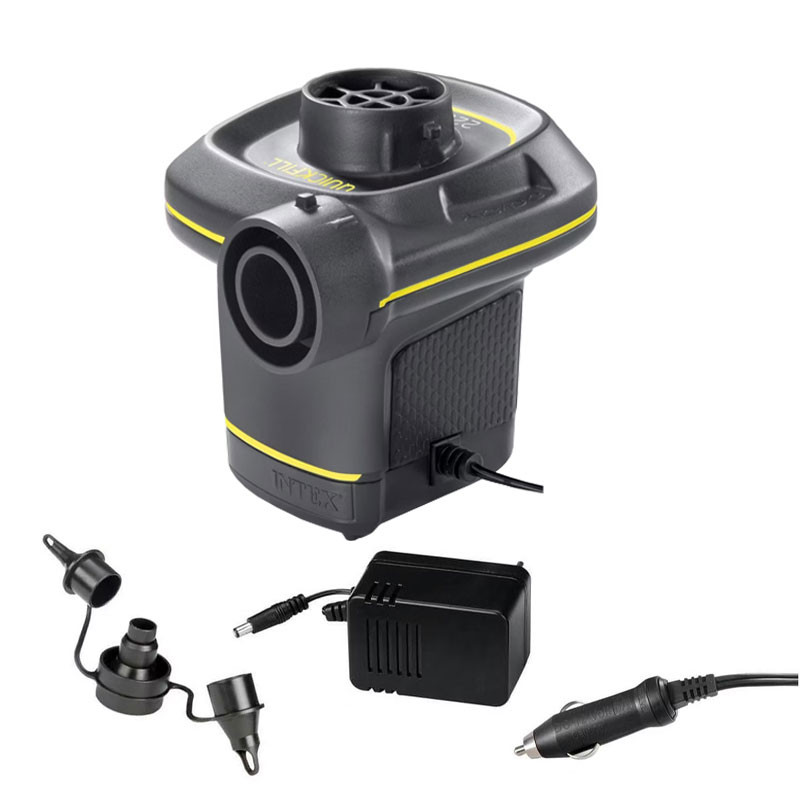 A pumpa többféle fúvóka adapterrel rendelkezik, így különböző szeleptípusokhoz is könnyen csatlakoztatható. Az Intex kifejezetten ezt a típusú pumpát ajánlja felfújható termékeihez, mivel a hagyományos kompresszorok használata károsíthatja az anyagot.